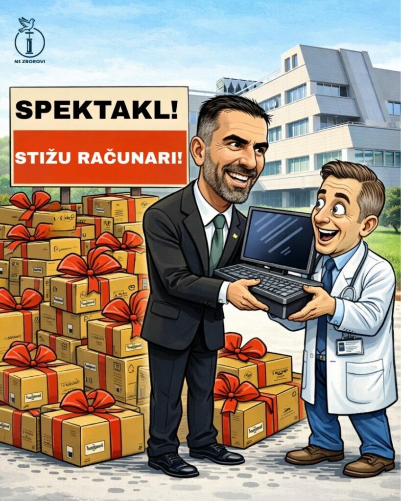 Ako ste mislili da se računari kupuju običnom nabavkom? Naravno da ne! Ali tamo gde je korupcija tu je, naravno, tzv. gradonačelnik, v.d. direktorka i svečana sala da bi se obeležio dolazak osnovnih sredstava za rad u 2026. godini.